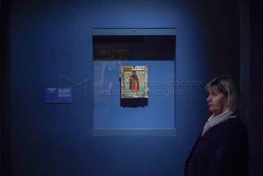 Икона «Покров Богоматери» (последняя четверть XV века) (в центре) на предпоказе выставки «Великое княжество. Сокровища Владимиро-Суздальской земли» в выставочном зале в здании Государственной Третьяковской галереи на ул. Крымский Вал.