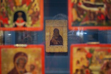 Иконы-таблетки (вторая половина XVI в.) на предпоказе выставки «Великое княжество. Сокровища Владимиро-Суздальской земли» в выставочном зале в здании Государственной Третьяковской галереи на ул. Крымский Вал.