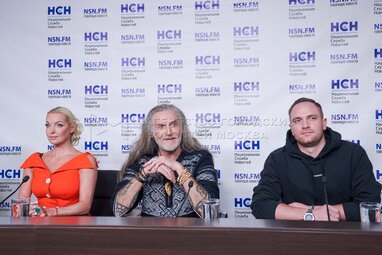 Заслуженная артистка России Анастасия Волочкова и народный артист Чеченской Республики Никита Джигурда (в центре) во время презентации патриотической песни.