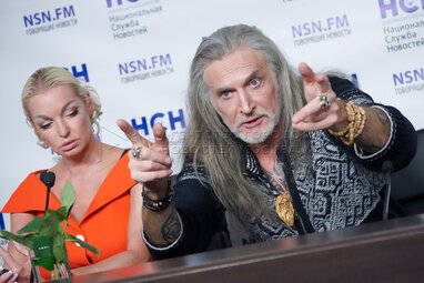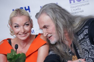 Заслуженная артистка России Анастасия Волочкова и народный артист Чеченской Республики Никита Джигурда во время презентации патриотической песни.