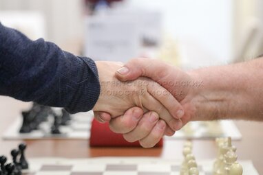 Шахматист Тимур Азизов и участник общегородского турнира по быстрым шахматам Владимир Анахин во время финала общегородского шахматного турнира в центре московского долголетия «Котловка».