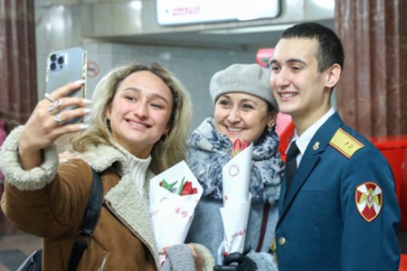 Поздравление женщин с Международным женским днем на станции «Курская» Московского метрополитена.