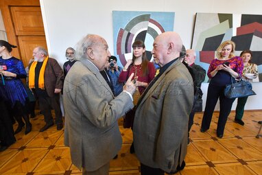 Президент Российской академии художеств Зураб Церетели (слева) и президент ассоциации художников театра, кино и телевидения Москвы Борис Мессерер во время открытия выставки живописи и графики Б.Мессерера «Темы и вариации» в Российской академии художеств.