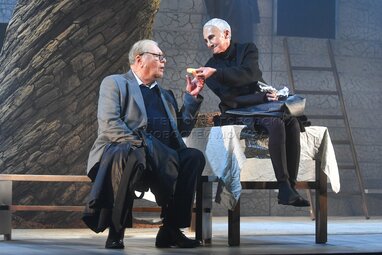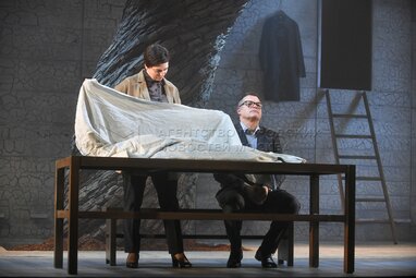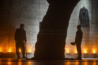 Актеры Алексей Вертков в роли Алекса (слева) и Валентин Смирнитский в роли Пьера во время пресс-показа спектакля «Разговоры после погребения» по одноименной пьесе французской актрисы и драматурга Ясмины Реза в постановке Вадима Дубровицкого в новом театральном пространстве «LA’Театра».