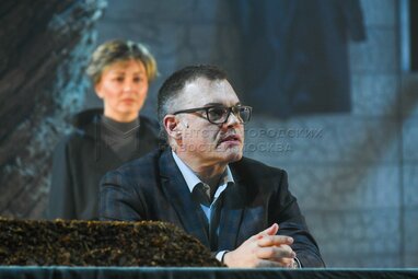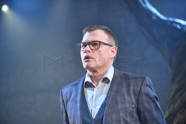 Актер Валентин Смирнитский в роли Пьера во время пресс-показа спектакля «Разговоры после погребения» по одноименной пьесе французской актрисы и драматурга Ясмины Реза в постановке Вадима Дубровицкого в новом театральном пространстве «LA’Театра».
