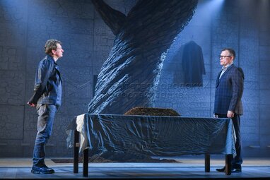 Актеры Алексей Вертков в роли Алекса (слева) и Евгений Дятлов в роли Натана во время пресс-показа спектакля «Разговоры после погребения» по одноименной пьесе французской актрисы и драматурга Ясмины Реза в постановке Вадима Дубровицкого в новом театральном пространстве «LA’Театра».