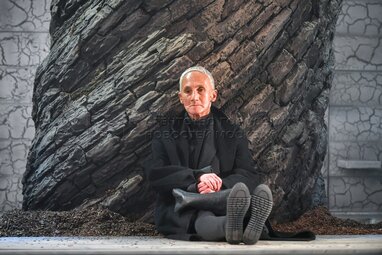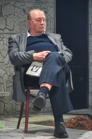 Актер Валентин Смирнитский в роли Пьра во время пресс-показа спектакля «Разговоры после погребения» по одноименной пьесе французской актрисы и драматурга Ясмины Реза в постановке Вадима Дубровицкого в новом театральном пространстве «LA’Театра».