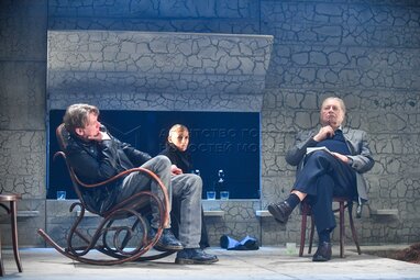 Актеры Алексей Вертков в роли Алекса, Роза Хайруллина в роли Жюльены и Валентин Смирнитский в роли Пьра (слева направо) во время пресс-показа спектакля «Разговоры после погребения» по одноименной пьесе французской актрисы и драматурга Ясмины Реза в постановке Вадима Дубровицкого в новом театральном пространстве «LA’Театра».