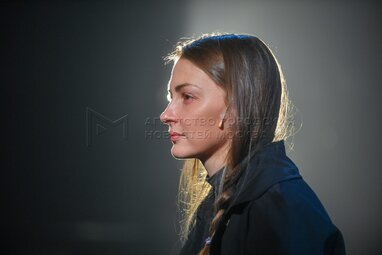 Актриса Татьяна Казючиц в роли Элизы во время пресс-показа спектакля «Разговоры после погребения» по одноименной пьесе французской актрисы и драматурга Ясмины Реза в постановке Вадима Дубровицкого в новом театральном пространстве «LA’Театра».
