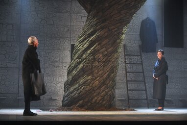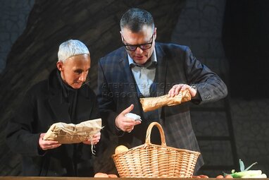 Актеры Валентин Смирнитский в роли Пьера и Роза Хайруллина в роли Жюльены во время пресс-показа спектакля «Разговоры после погребения» по одноименной пьесе французской актрисы и драматурга Ясмины Реза в постановке Вадима Дубровицкого в новом театральном пространстве «LA’Театра».