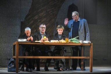 Актеры Роза Хайруллина в роли Жюльены, Евгений Дятлов в роли Натана, Татьяна Казючиц в роли Элизы и Валентин Смирнитский в роли Пьера (слева направо) во время пресс-показа спектакля «Разговоры после погребения» по одноименной пьесе французской актрисы и драматурга Ясмины Реза в постановке Вадима Дубровицкого в новом театральном пространстве «LA’Театра».