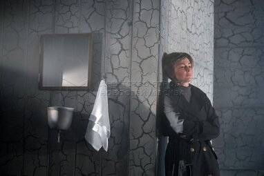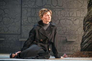 Актриса Нелли Уварова в роли Эдит во время пресс-показа спектакля «Разговоры после погребения» по одноименной пьесе французской актрисы и драматурга Ясмины Реза в постановке Вадима Дубровицкого в новом театральном пространстве «LA’Театра».