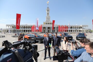 Генеральный директор МАЗ «Москвич» Дмитрий Пронин, генеральный директор каршеринговой компании «BelkaCar» Дмитрий Потапов и менеджер проектов шеринга Департамента транспорта города Москвы Полина Стасюк (слева направо) на территории парка Северного речного вокзала, где автомобили «Москвич» начали работу в сервисе каршеринга.