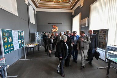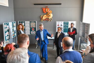 Министр правительства Москвы, руководитель Департамента культуры города Москвы Александр Кибовский (в центре) на открытии выставки «Символы Москвы: история и современность» в библиотеке №3 имени Николая Добролюбова.