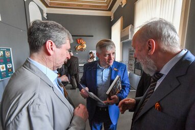 Министр правительства Москвы, руководитель Департамента культуры города Москвы Александр Кибовский (в центре) и член Геральдического совета при президенте РФ, заслуженный работник культуры РФ Олег Кузнецов (справа) на открытии выставки «Символы Москвы: история и современность» в библиотеке №3 имени Николая Добролюбова.