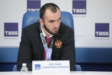 Российский боксер Муслим Гаджимагомедов, завоевавший золотую медаль в весовой категории до 92 кг, во время пресс-конференции, посвященной достижениям мужской сборной России по боксу на чемпионате мира в Ташкенте (Узбекистан), который проходил с 1 по 14 мая 2023 года.