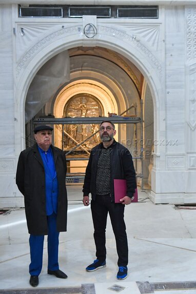 Настоятель Подворья патриарха Московского и всея Руси при храме святого равноапостольного великого князя Владимира в Тушине иерей Александр Кузнецов (слева на первом плане) и член комитет Государственной Думы РФ по строительству и жилищно-коммунальному хозяйству Владимир Ресин (в центре) во время выездного совещания на стройплощадке храмового комплекса в честь святого Владимира в Тушино.