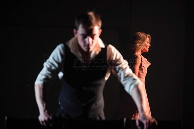 Актеры Евгения Курова в роли Неизвестной и Евгений Шишкин в роли Поручика во время показа спектакля «Случайные встречи», созданного в рамках режиссерской лаборатории «Хочу как О.Н.», на сцене Московского театра «Современник».