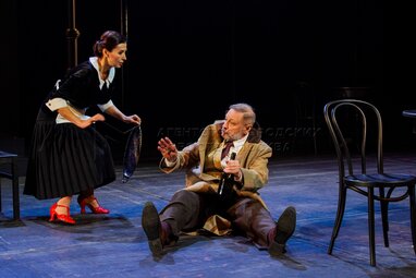 Актеры Сергей Юшкевич в роли генерала Николая Платоныча и Лара Чаклин в роли Ольги Александровны во время показа спектакля «Случайные встречи», созданного в рамках режиссерской лаборатории «Хочу как О.Н.», на сцене Московского театра «Современник».