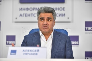 Руководитель фракции «Новые люди» в Государственной думе Алексей Нечаев во время пресс-конференции лидеров партий, посвященной обсуждению планов на грядущие выборы.