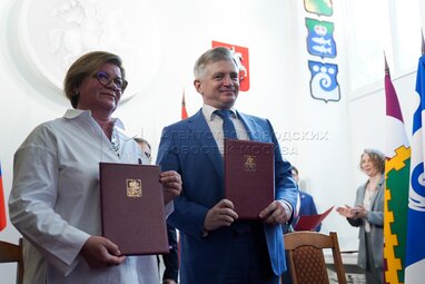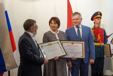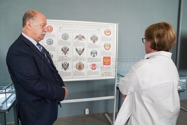 Председатель Комитета по вопросам государственной власти и региональной безопасности Мособлдумы Александр Баранов и первый заместитель председателя Мособлдумы Лариса Лазутина во время открытия первого Московского геральдического форума в библиотеке №3 имени Добролюбова.