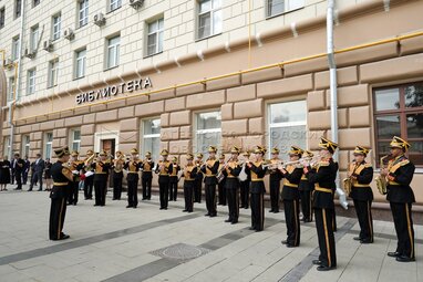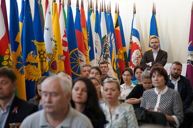 Директор Центрального музея Великой Отечественной войны (ВОВ) Александр Школьник (слева на втором плане) и ректор РГСУ Андрей Хазин (справа на втором плане) во время открытия первого Московского геральдического форума в библиотеке №3 имени Добролюбова.