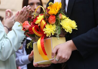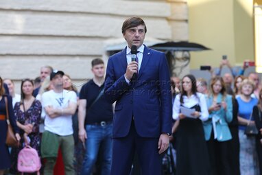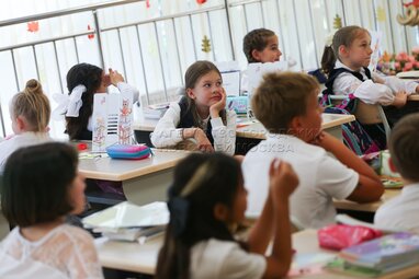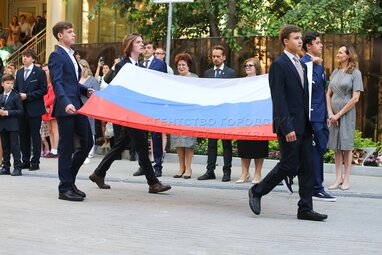 Торжественная линейка ко Дню знаний с участием министра просвещения РФ Сергея Кравцова в московской школе №1529 имени Грибоедова по адресу: Староконюшенный пер., д. 18.