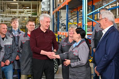 Мэр Москвы Сергей Собянин (в центре) во время запуска серийной сборки новой модели автомобилей – седана «Москвич 6». Фото: пресс-служба мэра и правительства Москвы