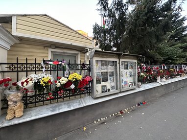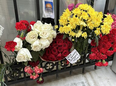 Цветы, свечи и мягкие игрушки у посольства Палестины в Москве