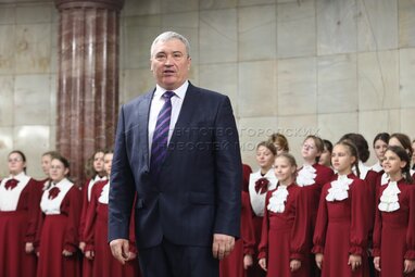 Художественный руководитель Большого детского хора имени В.С. Попова Анатолий Кисляков во время выступления Большого детского хора в аванзале станции метро «Курская».