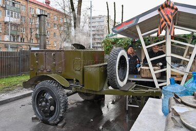Пункт приготовления пищи (Полевая кухня). Единый пункт отбора на военную службу по контракту, расположенный на ул. Яблочкова. Фото: Максим Мишин, пресс-служба мэра и правительства Москвы.