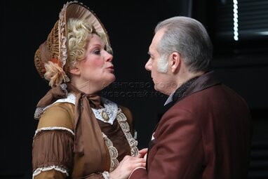 Актеры Александр Бобровский в роли Карпа Саввича Искрина и Лариса Наумкина в роли вдовы Варвары Саввишны Вельдюзевой во время предпремьерного показа спектакля «Замужняя невеста» в Театре имени Моссовета на сцене «Под крышей».