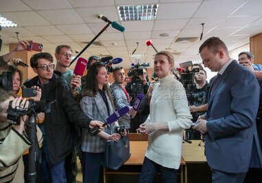 Экс-замминистра Минпросвещения РФ Марина Ракова (справа по центру) и адвокат Дмитрий Кравченко (справа). Оглашение в Никулинском суде приговора бывшему ректору Московской высшей школы социальных и экономических наук «Шанинка» Сергею Зуеву, экс-замминистра Минпросвещения РФ Марине Раковой и другим фигурантам дела о мошенничестве.