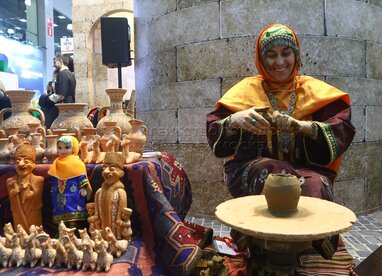 Участница выставки в национальном костюме во время работы на гончарном круге. Международная выставка туризма и индустрии гостеприимства MITT 2024 в МВЦ «Крокус Экспо».