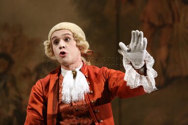 Актер Федор Бавтриков в роли Эраста, молодого человека, влюбленного в Люсиль, во время премьерного показа спектакля «Любовная досада» в московском театре Et Cetera.
