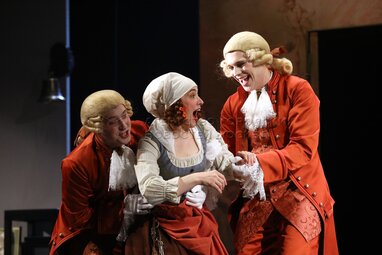 Актриса Наталья Баландина в роли Маринетты, служанки Люсили, актеры Павел Суханов (слева) и Владимир Урм – исполнители ролей слуг просцениума во время премьерного показа спектакля «Любовная досада» в московском театре Et Cetera.