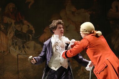 Актер Федор Бавтриков в роли Эраста, молодого человека, влюбленного в Люсиль (слева), во время премьерного показа спектакля «Любовная досада» в московском театре Et Cetera.