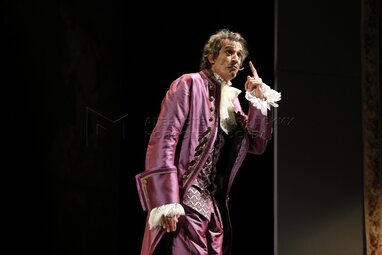 Актер Андрей Кондаков в роли Маскариля, слуги Валеры во время премьерного показа спектакля «Любовная досада» в московском театре Et Cetera.