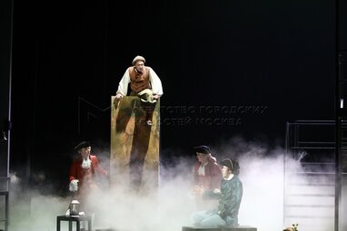 Актер Андрей Кондаков в роли Маскариля, слуги Валеры (в центре) во время премьерного показа спектакля «Любовная досада» в московском театре Et Cetera.