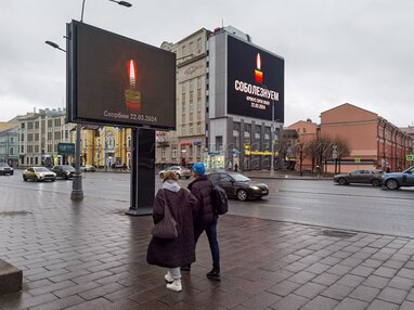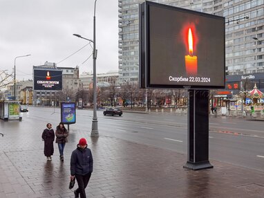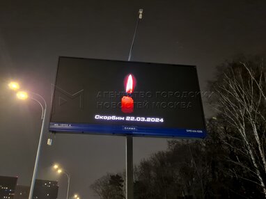 Уличные медиаэкраны в столице с изображением свечи и траурной надписью в память о жертвах теракта в подмосковном Crocus City Hall.