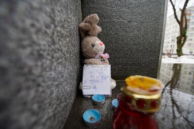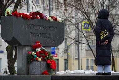 День общенационального траура в России в память о жертвах теракта в Crocus City Hall. Цветы возле памятника жертвам терроризма на площади у Театрального центра на Дубровке.