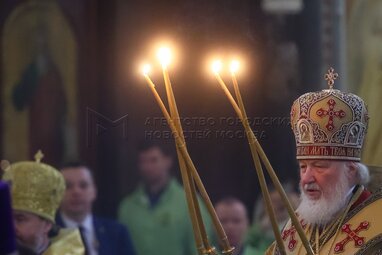 Патриарх Московский и всея Руси Кирилл во время богослужения в праздник Торжества православия 24 марта 2024 года в кафедральном соборном храме Христа Спасителя.