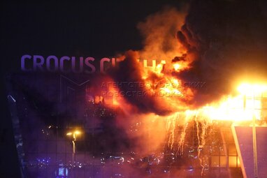 Горящее здание Crocus City Hall в подмосковном Красногорске.