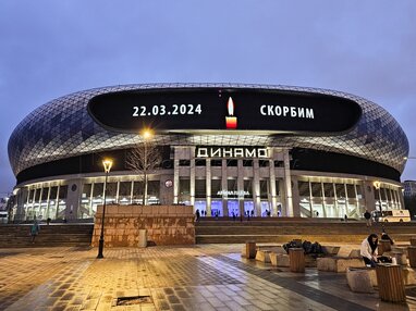Надпись «Скорбим» на медиаэкране «ВТБ Арены» – центрального стадиона «Динамо» имени Льва Яшина в память о жертвах теракта в подмосковном Crocus City Halll.