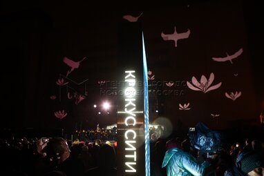 Фотографии погибших – проекция на стене во время выступления симфонического оркестра под управлением Валерия Гергиева. Акция у здания Crocus City Hall после девяти дней с момента теракта вечером 22 марта, в результате трагедии пострадали 695 человек, из них 144 человека погибли.