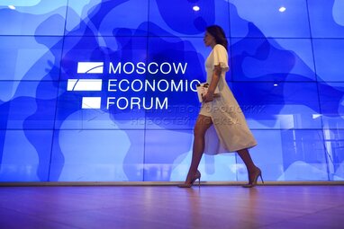 Логотип Московского экономического форума на экране на территории Цифрового делового пространства.