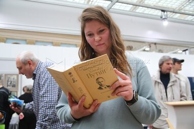 Посетительница ярмарки с книгой Александра Мясникова «Владимир Путин». Открытие весенней ярмарки интеллектуальной литературы non/fictioN в выставочном центре «Гостиный двор».