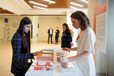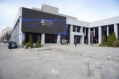 Логотип Московского экономического форума на экране на территории Цифрового делового пространства.