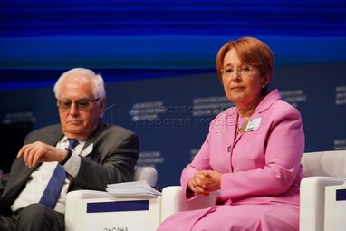 Научный руководитель Института океанологии имени П.П. Ширшова Роберт Нигматулин и член Комитета Госдумы РФ по бюджету и налогам Оксана Дмитриева во время пленарной дискуссии «Экономика: новая реальность – новые подходы» на Московском экономическом форуме – 2024 в Цифровом деловом пространстве.