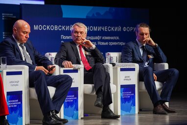 Заместитель секретаря Общественной палаты РФ Александр Галушка, член Комитета Совета Федерации по бюджету и финансовым рынкам Евгений Савченко и генеральный директор ООО «Машиностроительный завод «Тонар» Денис Кривцов (слева направо) во время пленарной дискуссии «Экономика: новая реальность – новые подходы» на Московском экономическом форуме – 2024 в Цифровом деловом пространстве.